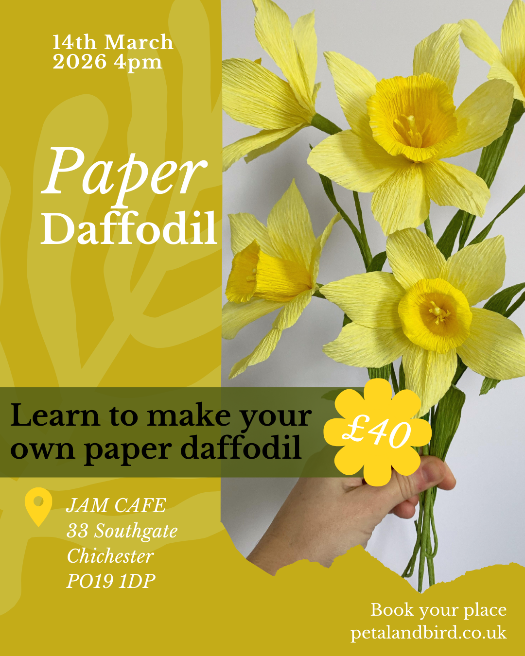 Join Clare of Petal & Bird for a couple of hours of paper creativity and learn to make your own paper daffodil.